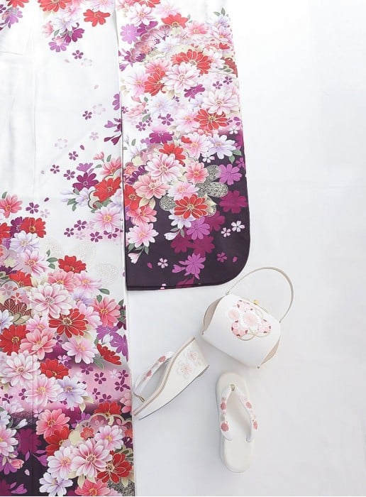 人気の白地に紫や赤、ピンクの花のデザインがふんだんに散りばめられているのが特徴で、どこから撮影しても華やかな振袖。全体は可愛い色合いですが、袖や裾にかけて深い紫のグラデーションが入っていることでキュートになりすぎないので、白やピンクに挑戦しやすい1着。 髪飾りにも同系色を合わせる事で全体の統一感がでてオススメです。