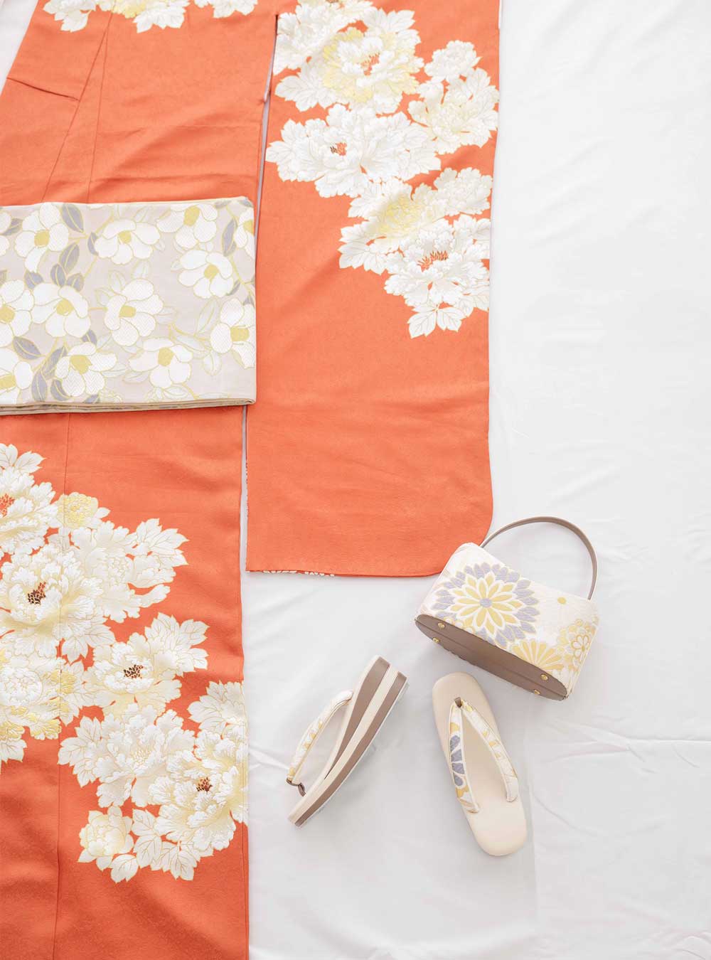 鮮やかなオレンジ色を基調とした上品なデザインが特徴。生地全体には白い花の模様が描かれており、着物に華やかさと優雅さを加えています。花模様は立体感と奥行きを感じさせ、上品で華やかな印象を与えます。 セットの帯は柔らかなベージュ色で全体のコントラストを優しく引き立てます。晴れの日の特別な場にふさわしいデザインとなっています。