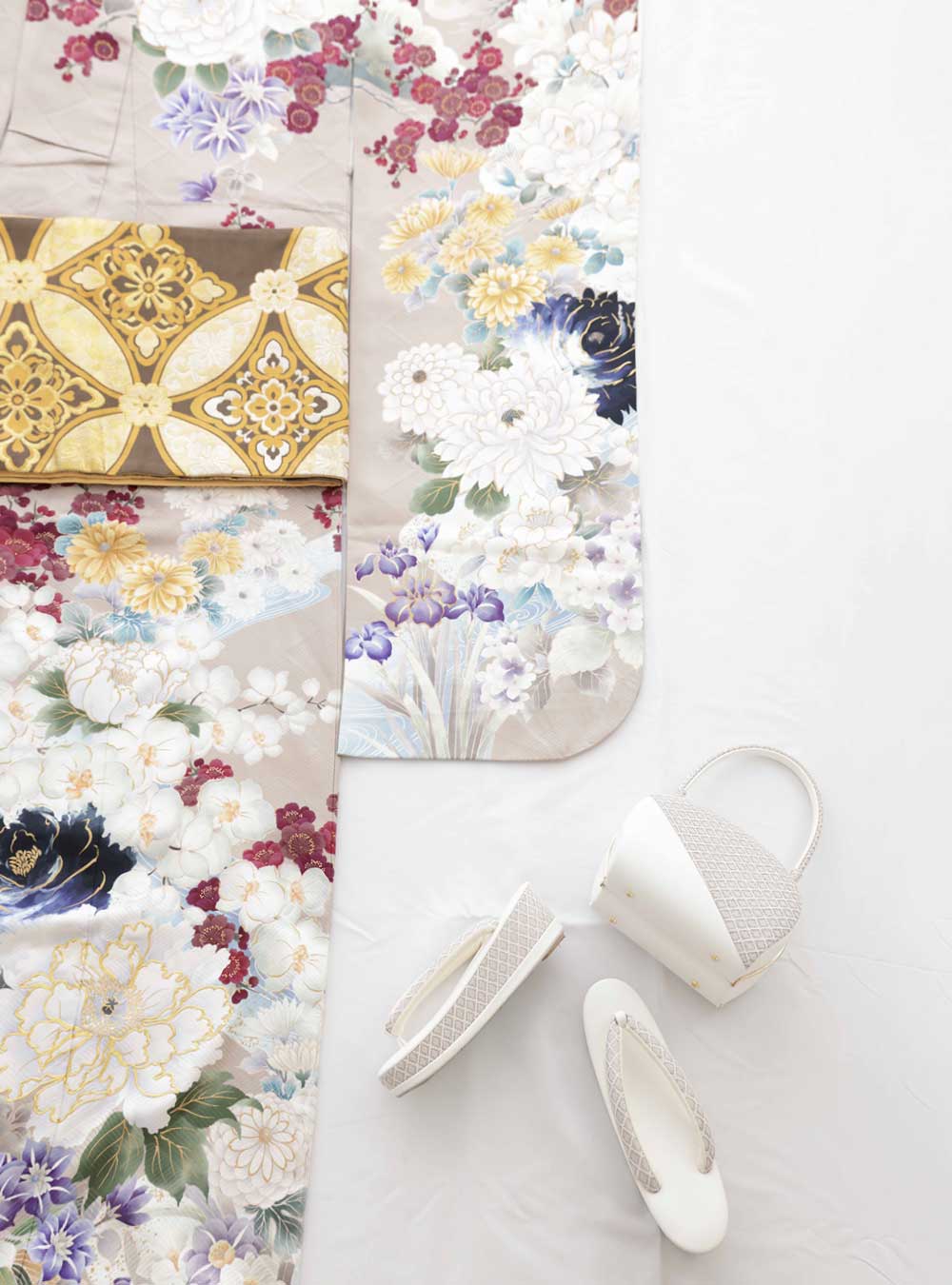 淡いベージュ色を基調にした振袖。桜、菊、牡丹など様々な花の種類が、白や赤、紫、黄色のたくさんの色味でバランスよく配置されており、全体的に華やかでありながらも上品な印象に! セットの帯は黄金色をベースにした豪華なデザイなので振袖の華やかさをさらに引き立てます。豪華な帯をメインに帯締めなどの小物はシンプルに合わせるのがオススメ!