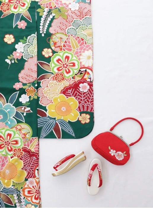 黄色がかった緑を基調とした華やかなデザインが特徴的な振袖。大きな花模様が全体に描かれており、黄色や赤、青などの色鮮やかな花々が目を引きます。振袖に描かれている大きな花模様がスタイル良く見せてくれる一着です。 華やかな中にもレトロ感を楽しめるので、小物は赤色や黄色等で統一感を出すことがオススメ!