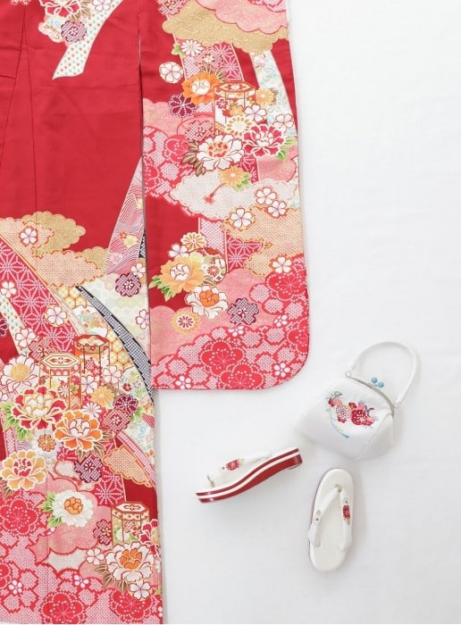 王道の赤地の振袖。 高級感を感じさせる絞り柄が施された全世代に人気のお振袖。梅や桜、牡丹といった目を引くお花が散りばめられた中に、熨斗や貝桶、雲取りと縁起が良いとされるデザインが惜しみなく広がります。 鮮やかな赤の着物に、袖から裾まで隙間なく広がるデザインが華やかな印象を与え、晴れの日の特別な場にで目を引く事間違いなしの一着。