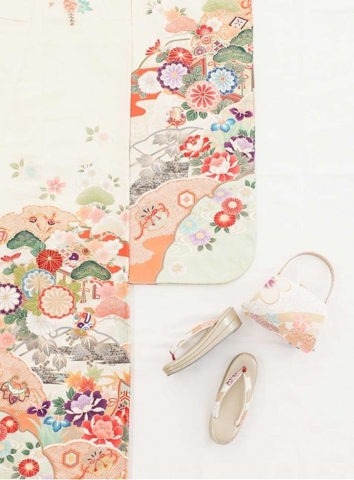 淡いクリーム色を基調とし上品で優しい雰囲気を醸し出している振袖。全体には日本の伝統的な花々や自然の風景が繊細に描かれており、特に菊や桜などの花柄が美しく配置されています。 また、松や竹などの日本庭園を思わせる植物も取り入れられ、古典的な美しさが際立つ1着。山水画のような風景模様も含まれており、全体に落ち着いた印象が。帯締め等の小物に濃い緑色をコーディネートする事で全体が引き締まるのでオススメ!
