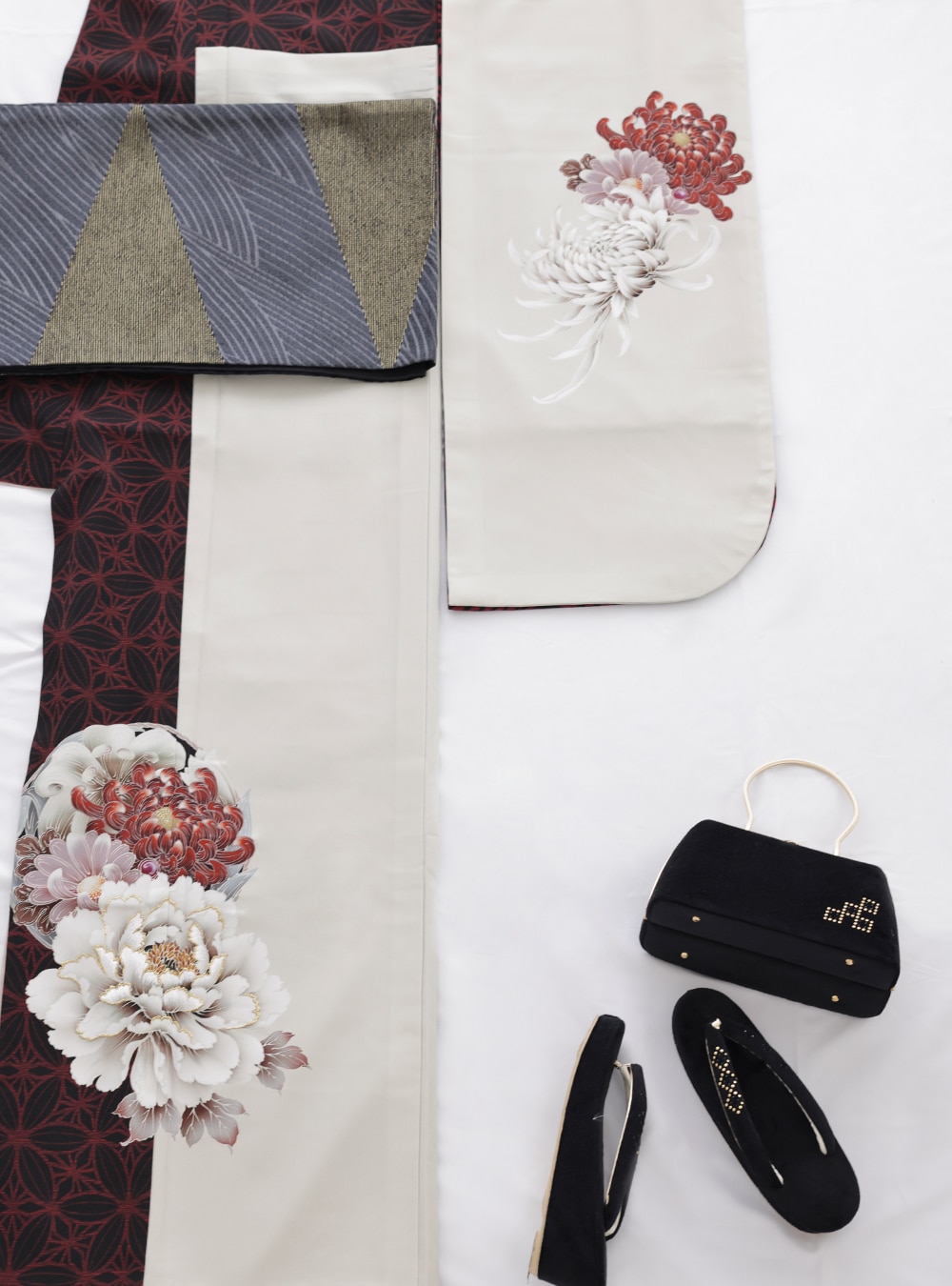 ホワイトベージュと深みのある赤黒のバイカラーの振袖。左右で全く異なるデザインなので撮影でも撮る向きにより違う雰囲気を楽しめます!シンプルながらも黒地に赤色でデザインされた七宝柄や、右袖の黒とピンクの流れるような波紋柄が、モダンな雰囲気を演出しています。帯も二つのデザインが組み合わされている周りと被りたくない方にオススメの一着。