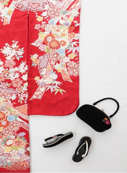 鮮やかな赤を基調とした振袖で、豪華な花柄と繊細な模様が施されています。牡丹や菊、桜などの伝統的な花々が、白やピンク、黄色、青などの多彩な色で描かれ、華やかさと可憐さを兼ね備えています。さらに、花柄の間には金糸が織り込まれ、全体に上品な輝きを与えています。 袖や裾には、雲取りや流水模様がデザインされており、日本の四季や自然の美しさを表現しています。