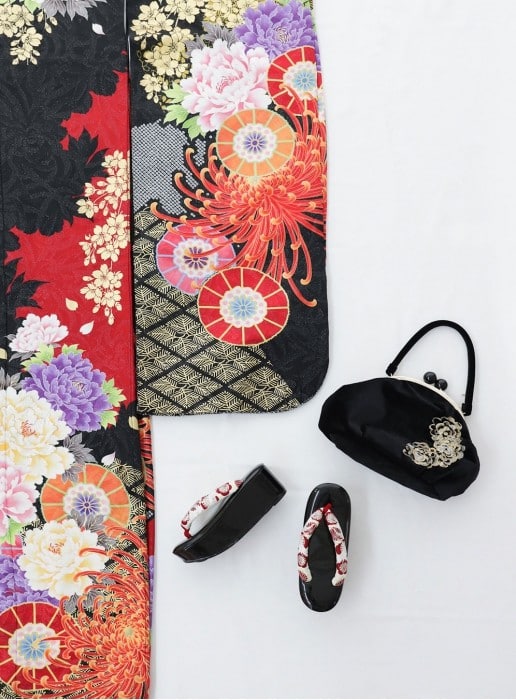 赤地に黒、オレンジの他様々な色がたくさん施された1着。襟元の色が左右で違うので(赤と黒)撮影する方向で色んな雰囲気を楽しめるのもポイント!袖や裾には大きなオレンジの菊がデザインされていることで全体のアクセントに。 小物にもオレンジカラーを使用することで統一感が出て、全体がより華やかになるのでオススメです。