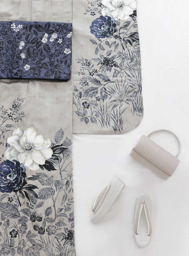 淡い銀鼠の地に墨色で描いた草花が裾に大きく咲くモードな佇まいの1着。繊細な地紋とほどよい艶が光を受けてやわらかく揺れ、余白の美しさが花柄の存在感をいっそう引き立てます。白と黒の濃淡で表現された花びらは陰影が美しく、近くで見ても遠目でも印象的。全体を落ち着いたトーンでまとめているため凛とした大人の雰囲気が際立ち、写真では透明感のある肌映りに。さりげなく個性を出したい方におすすめです!