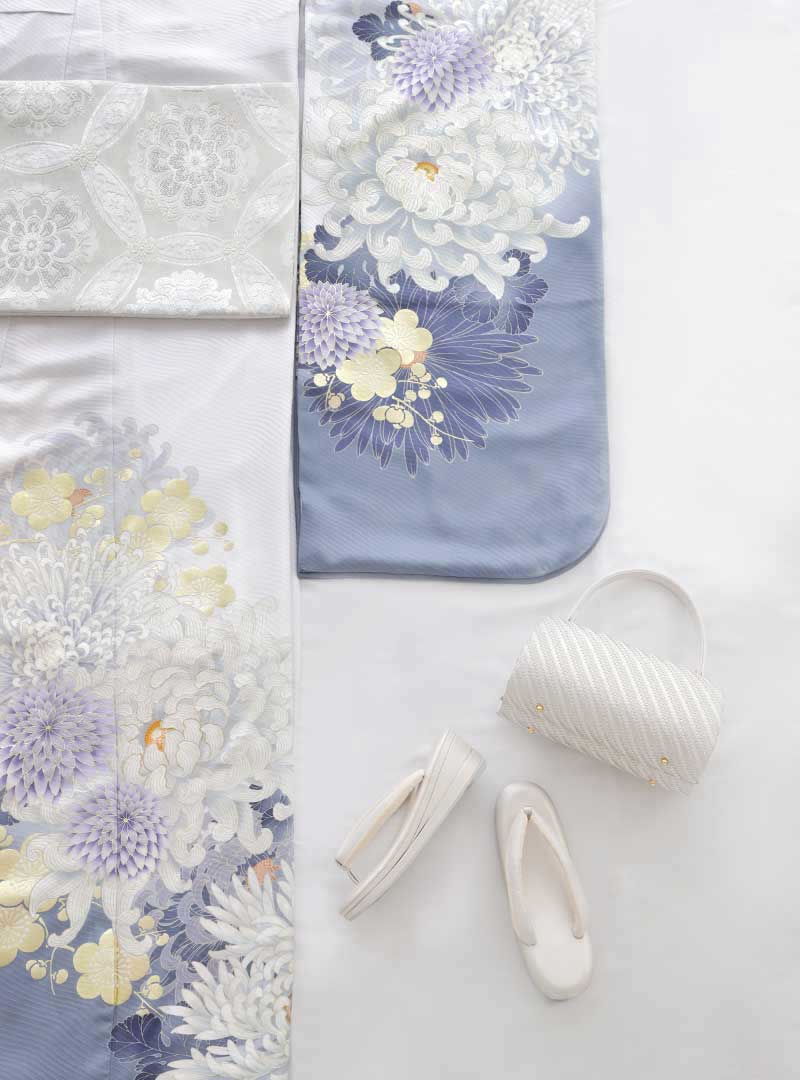 澄んだ白の地に藤紫や淡い黄、青みのグレーが溶け合う透明感あふれる振袖。裾から袖へと大輪の菊が幾重にも咲き重なり、花びらの陰影がふわりと立ち上がって、近くで見ても奥行きのある表情を楽しめます。ところどころに散る小花がリズムをつくり、優しい配色の中に可憐な華やぎをプラス。裾の青みグレーのぼかしが全体を引き締め、甘さだけに寄らない上品さも魅力です。清楚で凛とした雰囲気が写真にも映え、柔らかな印象を大切にしたい方にぴったりの1着!