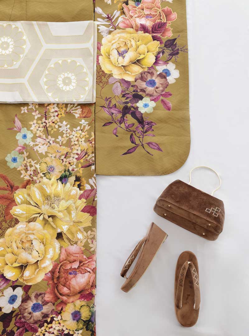 深みのある黄土の地色に、咲きこぼれるような大輪の花々を描いた振袖。裾へ向かってバラや牡丹を思わせる花が大きく広がり、紫や生成り、淡いブルーの差し色が華やかさの中に透明感を添えます。全体はあたたかなトーンでまとめつつ、花芯や葉の陰影が立体感を生み、近くで見ても美しい表情に。レトロな気配と上品な艶を併せ持ち、落ち着きと華やぎを両立した1着!