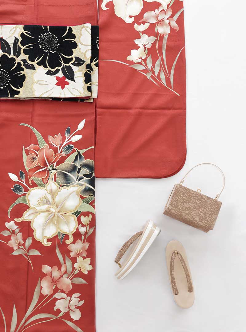 深みのある緋色の地に、艶やかな百合を主役にした花意匠が咲き誇る振袖。大輪の花びらは乳白から淡い金へとやさしくぼかされ、陰影が立体感を生み出します。袖や肩には墨黒のアクセントが入り、甘さを引き締めてモードな表情に。さらに細やかな枝花が余白を軽やかに埋め、歩くたびに花がふわりと浮かび上がります。王道の赤でありながら大人っぽく、写真でも存在感が際立つ1着!