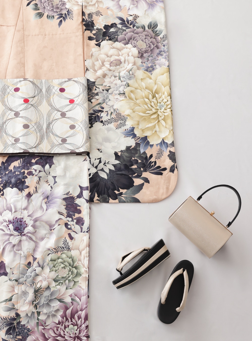 上品で落ち着いた淡いベージュカラーの地色に、白、紫、黒、黄緑、グレーと色とりどりの花々が美しく調和して、より一層大人の女性の魅力を引き立てる1着。 ふわりと広がる袖に繊細な葉や茎の繊細な描写が、奥行きと上品さを添え、まるで生花のように生き生きとしています。