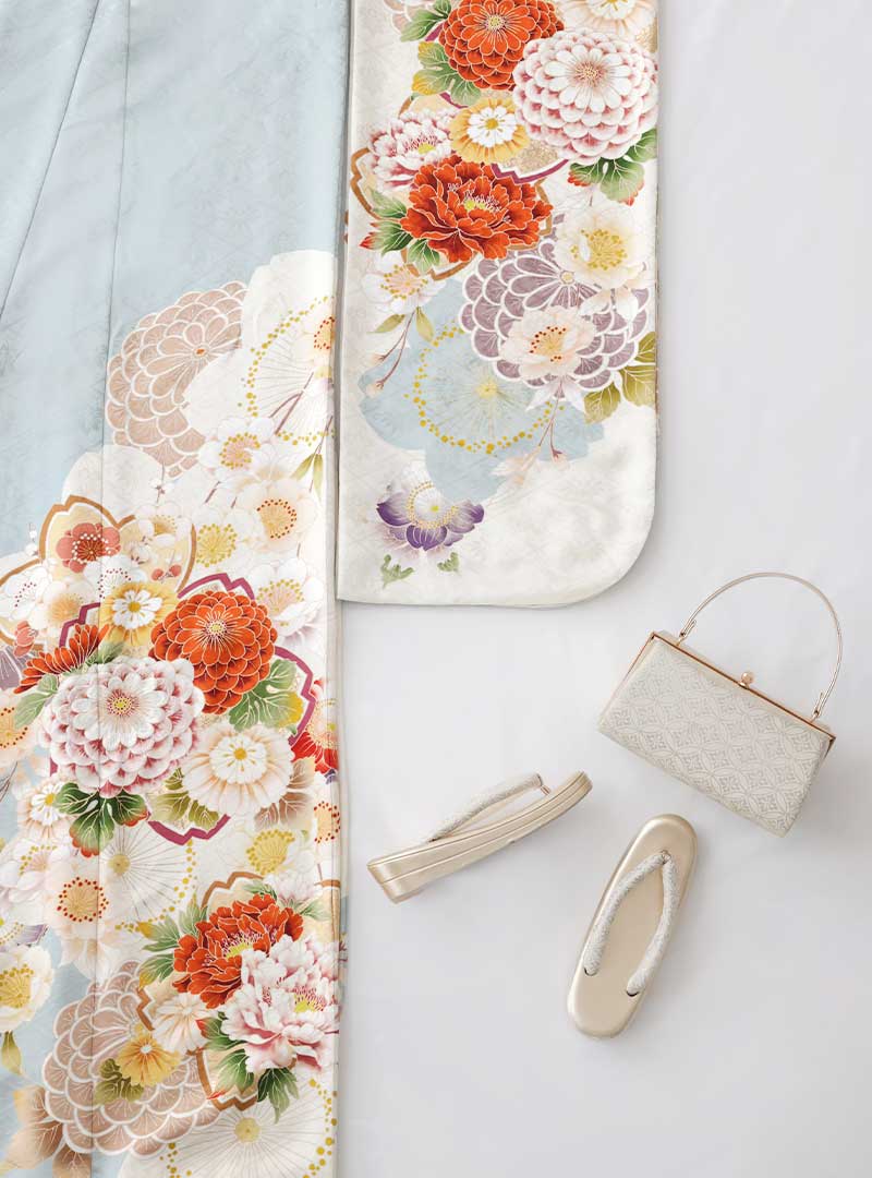 落ち着いた水色をベースに華やかな柄をバランスよく配した振袖。主張しすぎない色味が柄ひとつひとつを引き立ててくれます。全体にまとまりがあり上品さと華やかさを程よく感じられる1着。穏やかな雰囲気の中で、華やかさも楽しみたい方にオススメです。