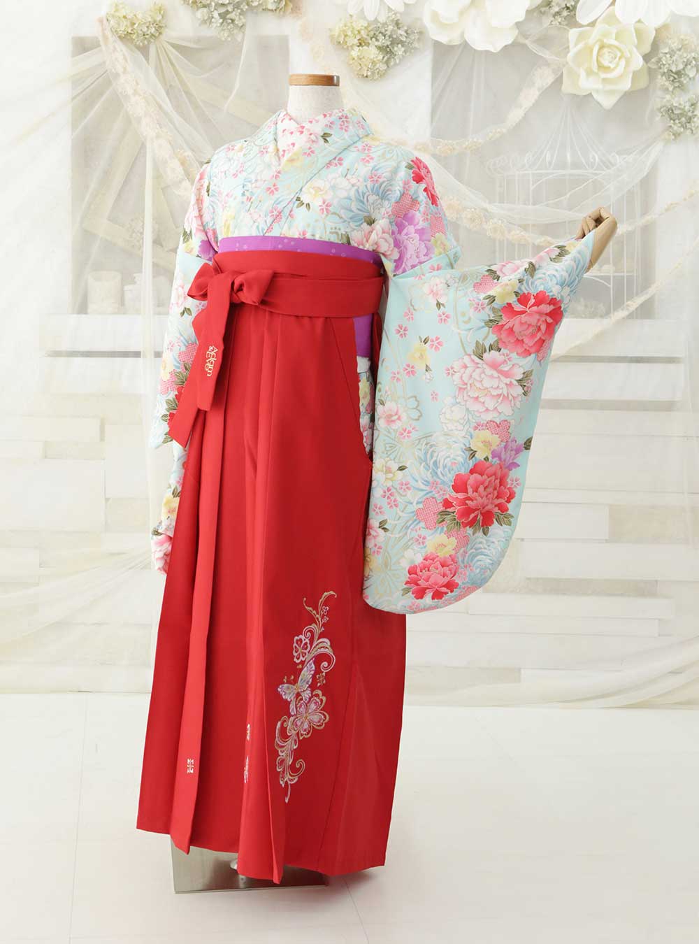 淡いブルーの地にピンクや赤の大きな花柄が描かれた着物と、鮮やかな赤の袴を組み合わせた上品な衣装です。着物の柔らかな色調と華やかな花柄が、エレガントで華やかな雰囲気を演出しています。袴の鮮やかな赤が全体のコーディネートにアクセントを加え、女性らしい魅力を引き立てます。上品でありながら華やかさも求める方におすすめの、洗練された美しさを感じさせる1着です。