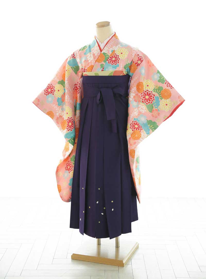 ピンクの地にカラフルな花柄があしらわれた着物と、深い紫色の袴を組み合わせた華やかな衣装です。着物は赤、青、緑の花々がバランスよく配置されており、明るく生き生きとした印象を与えます。深い紫色の袴が全体のコントラストを引き締め、落ち着きと品の良さを演出しています。可愛らしさと上品さが調和したデザインで人気の1着です。