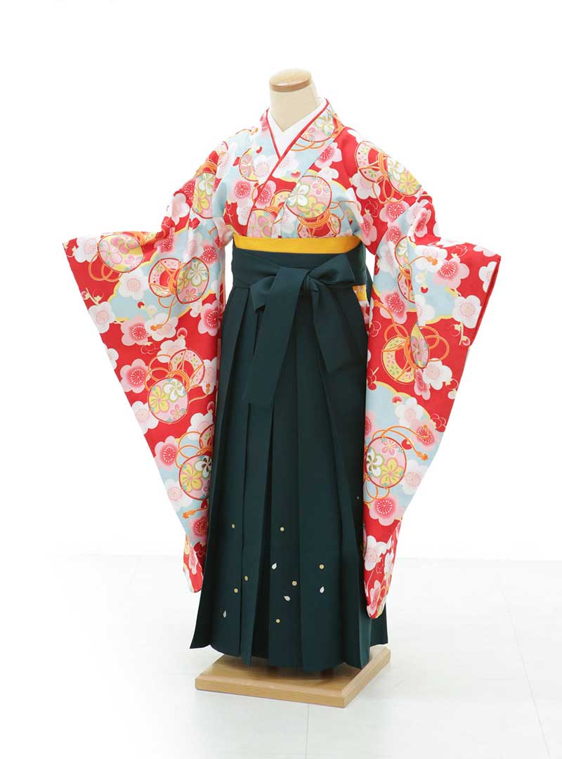 人気色でもある赤地の鮮やかさに深緑の上品さをプラスした卒業袴です。深緑の袴は赤色の鮮やかさをより引き立て、和装ならではの大胆な装いに仕上がります。 人気の古典柄と深緑の袴は王道でパッと目を引くコーディネートになっております。赤色の着物の中でも柄が大きく入っていて華やかで明るい印象を与えてくれるので晴れの日の卒業式にぴったりの衣装です。