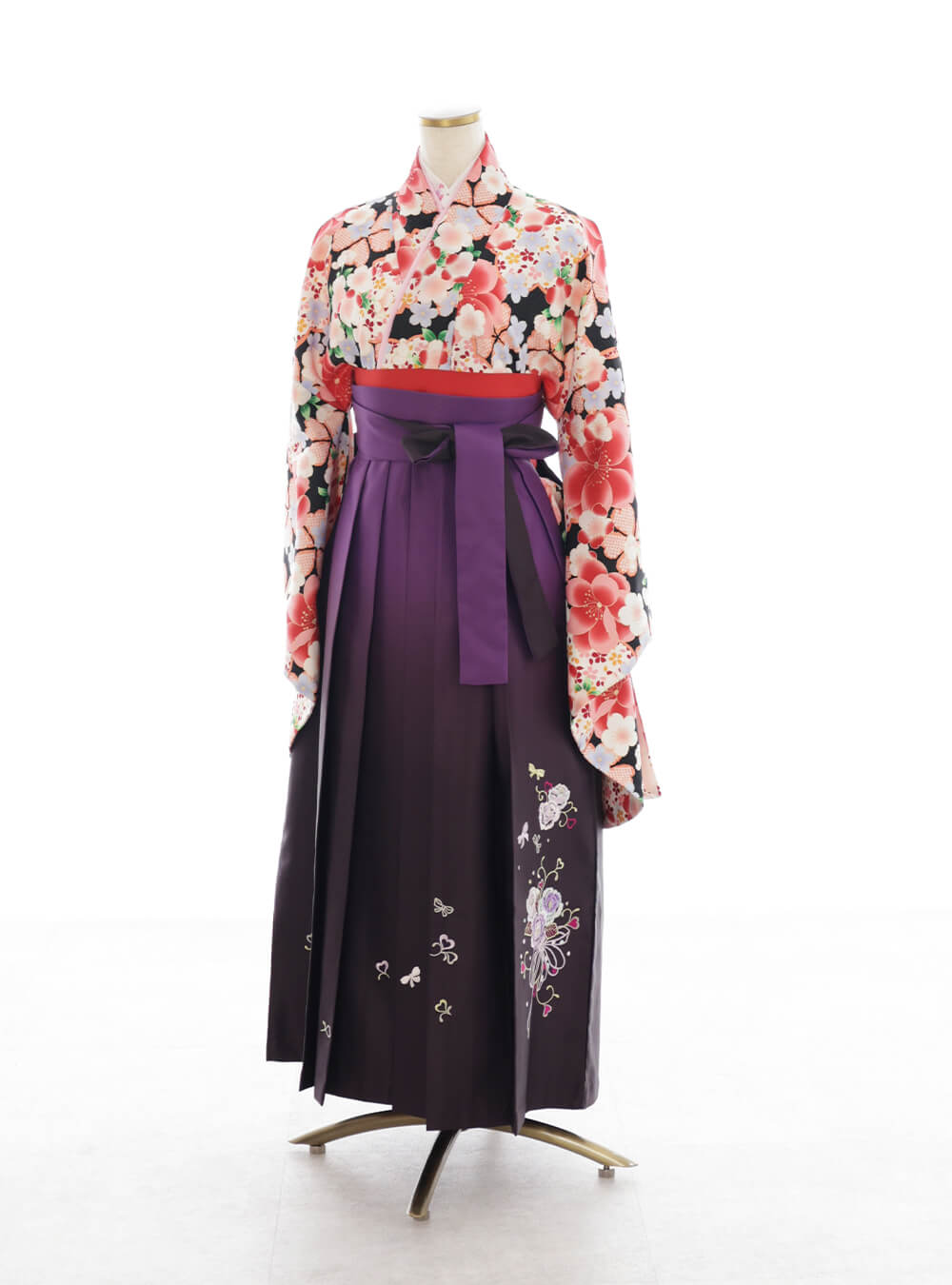 華やかな桜柄の着物に、深い紫の袴を合わせた上品な一着です。袴には繊細な刺繍が施され、可憐さと大人っぽさが絶妙に融合。 卒業式や特別な晴れの日に、エレガントな印象を演出してくれる装いです。