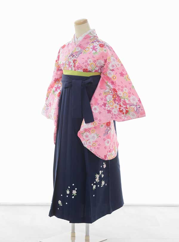 初々しさや可愛らしさ、女性らしい柔らかさを引き立ててくれるとされるピンク。明るく華やかなピンクは特別な日の雰囲気を盛り上げ、視線を引き付ける存在感がある色で、更に全体に咲き乱れる美しい花々が優美で可憐な印象を与えるてくれます。 そこに紺色の袴を合わせることで全体に落ち着きと品格を印象付けます。