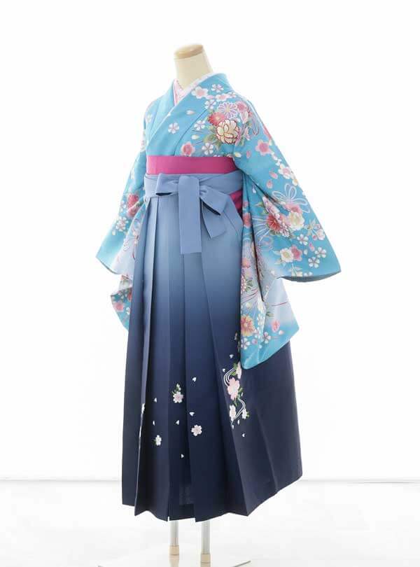水色の色合いが爽やかな印象の卒業袴。水色からネイビーへのグラデーションカラーの袴が上品で大人っぽいデザインです。 舞う桜が軽やかで優しい印象を与えます。桜は春に咲く花であることから「縁起が良いことのはじまり」という意味があり次のステップへと向かう卒業式にぴったりな柄となっています。