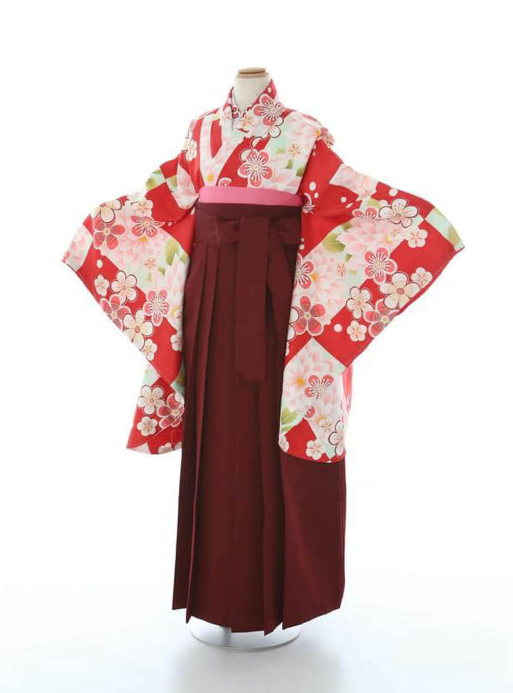 鮮やかな花柄が全体に広がる華やかな着物。赤やピンクを基調とした着物の生地には、梅や菊の花が色とりどりに描かれ、春を感じさせる柔らかく明るい印象を与えます。袴は深いえんじ色で、落ち着いた雰囲気を添えています。着物と袴の組み合わせが、華やかさと上品さが調和しているコーディネートで子どもらしさも大人らしさも感じられる1着です。