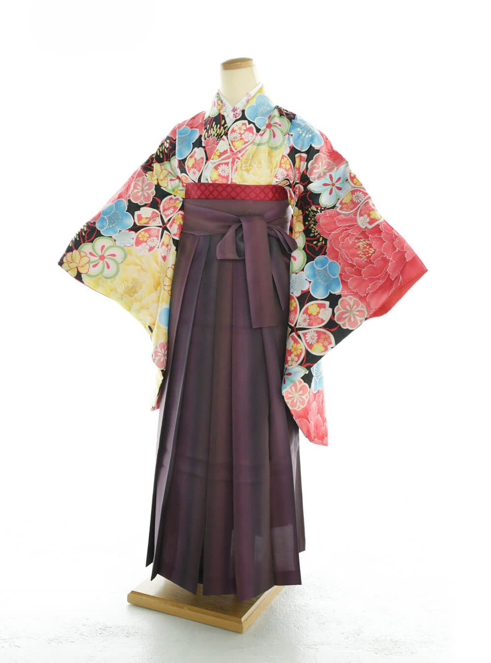 黒地にカラフルなデザインが特徴的な着物。黒地の着物に黄色や赤・青等の多彩な色合いの花柄がモダンな印象を与えます。特に、牡丹や梅の花が大きく豪華に描かれていて、花の色合いが黒地に映えてより際立ちます。 左右の袖に大きな牡丹の花柄が描かれているのも他の着物には無い、珍しいポイントです。紫の袴が着物を引き締めとてもオシャレな1着です。