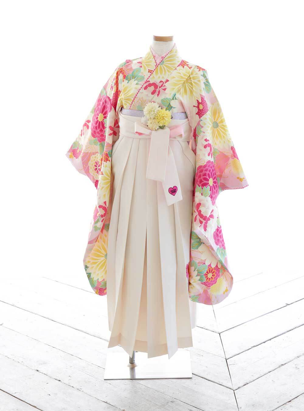 全体的にアイボリーのお色味のこの衣装は優しい柔らかい印象を与えてくれます。大きめの花柄の着物になっているので可愛らしさの中にも大胆で華やかな雰囲気のある衣装です。 シスタージェニーとのコラボの着物で可愛らしい甘い雰囲気がお好きな方におすすめの衣装です。この袴は洋風な雰囲気も兼ね備えているのでどんな髪型にも合う衣装になっています。