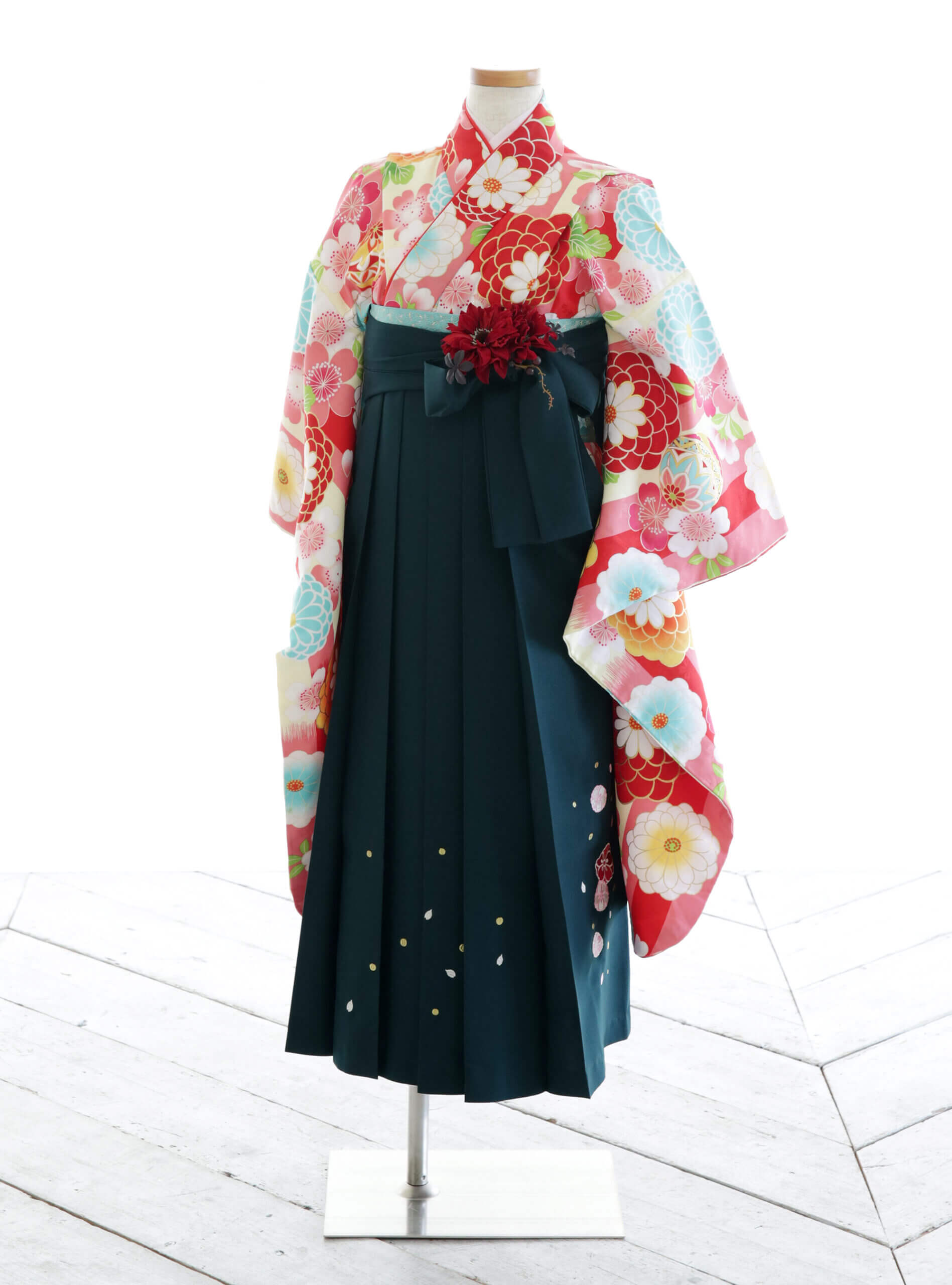 華やかなピンク色の花柄の着物に深緑色の袴でコーディネートすることによって清楚系で可愛らしいスタイルに!大きな菊の花と桜が全面に入っているこの卒業袴は華やかで優しく可愛らしい印象を与えてくれつつ、深めのお色味の袴を合わせることで落ち着いた雰囲気も醸し出してくれる衣装です。 ポップで可愛らしい雰囲気がお好きな方におすすめのお衣装です。