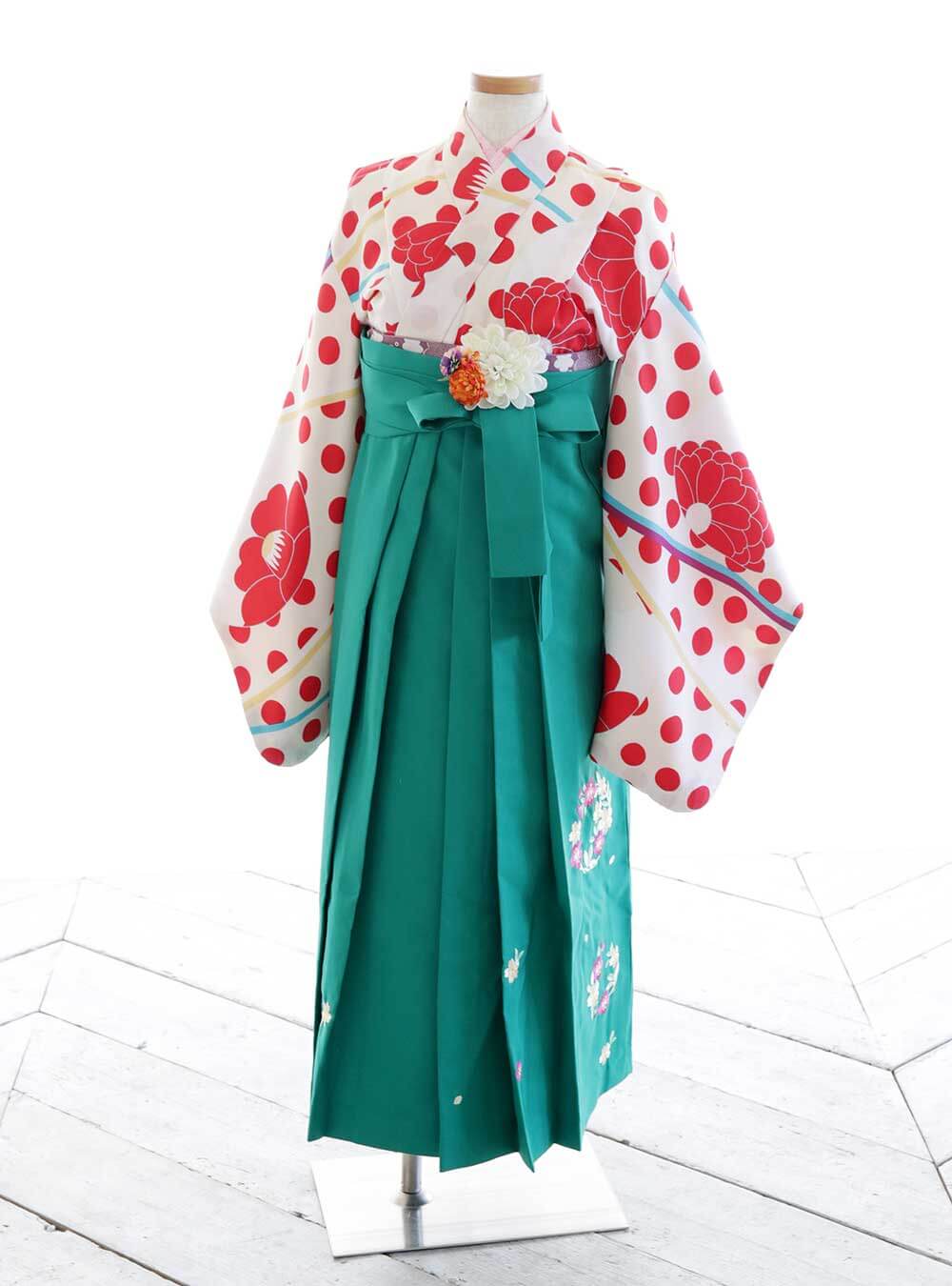 大きな赤色の牡丹の花とドット柄が個性的なこの衣装は今時なモダンな着こなしで存在感抜群!卒業式で華やかに目立つこと間違いなし!白地に赤色の牡丹とドット柄はレトロな雰囲気を漂わせつつ可愛らしさも兼ね備えた着物になっています。 明るい緑色の袴を合わせることで全体的にポップな印象で鮮やかで目を引く衣装です。髪飾りを大ぶりのものにすることによって華やかさアップでより一層目を引く卒業袴になっています。