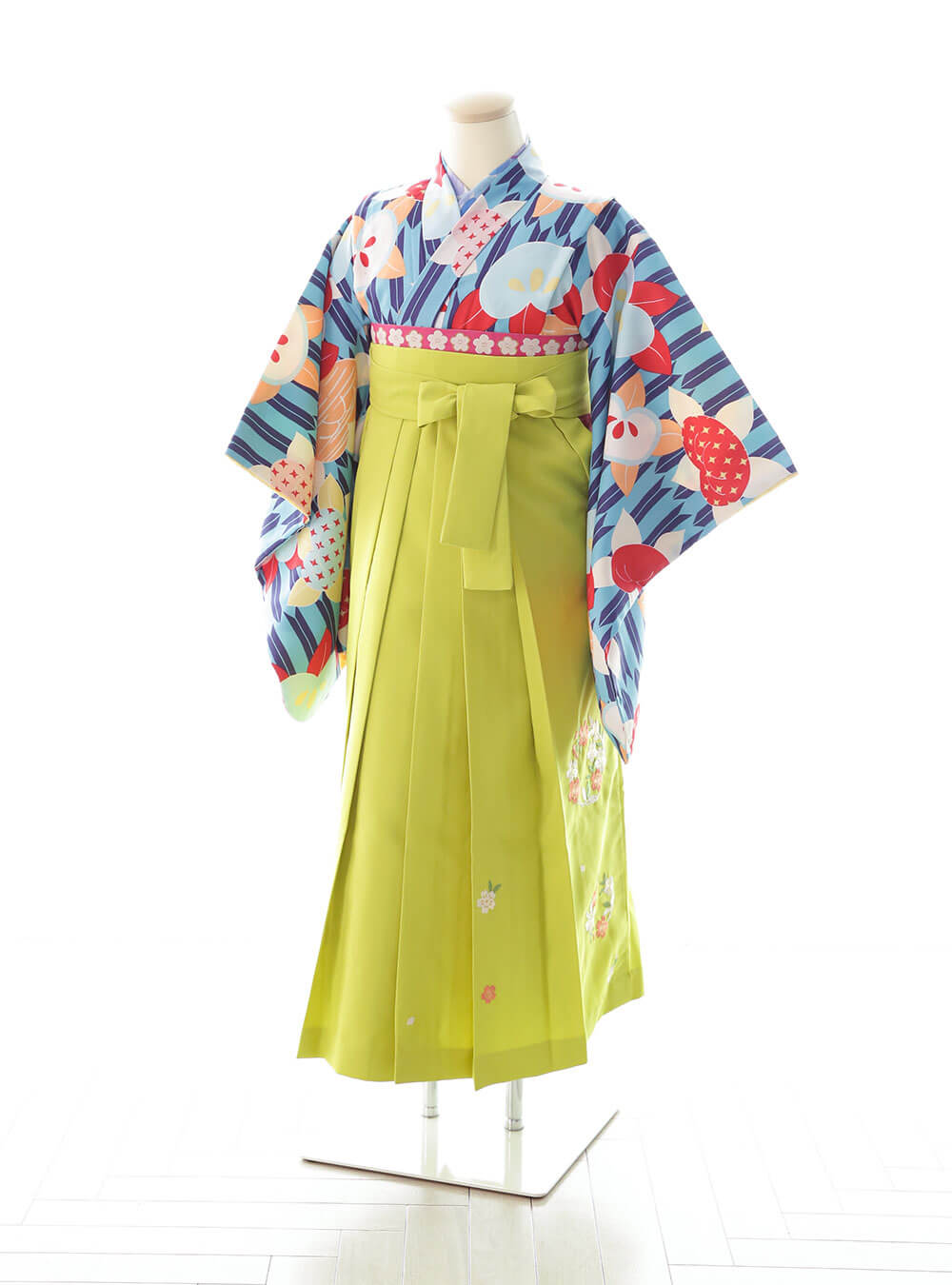 青の矢絣模様に松の柄が印象的な着物にライムグリーンの袴を合わせた個性的な雰囲気の卒業袴です。矢絣には前進という意味が込められており卒業式にはぴったりの定番の柄になっています。 そこにポップな松の柄が入ることによって明るく元気な印象を与えてくれます。着物、帯、袴の全てがビビットな色味になっているので卒業式当日も目立つこと間違いなし!
