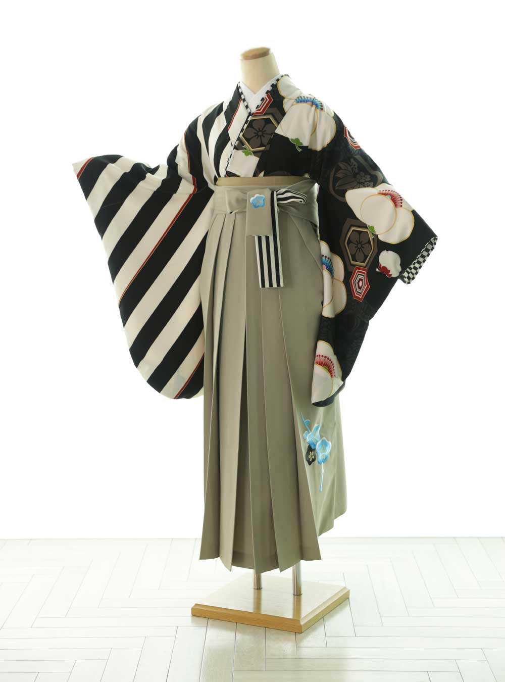 洗練されたデザインと伝統の美しさが見事に融合した一枚です。着物部分は深いブラックを基調にした大胆なストライプと柔らかな花柄が魅力的に施されています。このコントラストが華やかさを引き立て、目を引く存在感を演出します。斬新でありながらも伝統的な要素を感じさせるデザインです。 袴はグレーがかったベージュでシンプルな色合いは着物の華やかさを一層引き立て、全体のバランスが見事に調和しています。