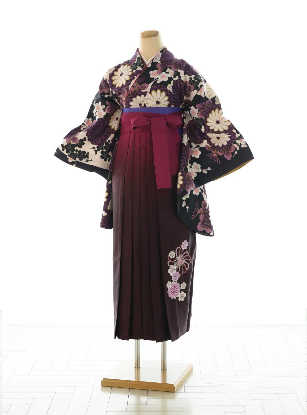 優雅さと格調高い美しさを兼ね備えた一枚です。着物部分は豊かな紫色を基調にし、鮮やかな花模様が施されています。深い色合いと華やかな花々のデザインが見事に調和し、幻想的な印象を与えています。袴は濃いボルドーで優雅なストレートラインが特徴です。 この深い色合いが着物の華やかさを引き立てつつ、全体に落ち着いた印象を与えています。