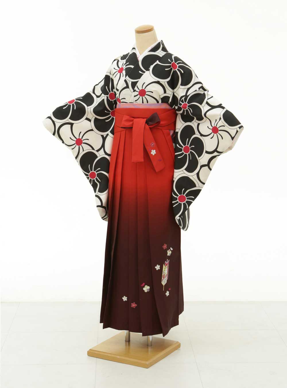 独特なデザインと鮮やかな色彩が魅力的な一枚です。着物部分はモノトーンのクラシックな模様が施されており、黒の背景に赤や白のアクセントが織り交ぜられています。伝統的な美しさと現代的なセンスが融合し、見る人に強い印象を与えます。袴は深いボルドーから赤へのグラデーションが美しく、全体のバランスを引き締めています。 この色合いは暖かみがありながらもエレガントで上品さを感じさせる一着です。