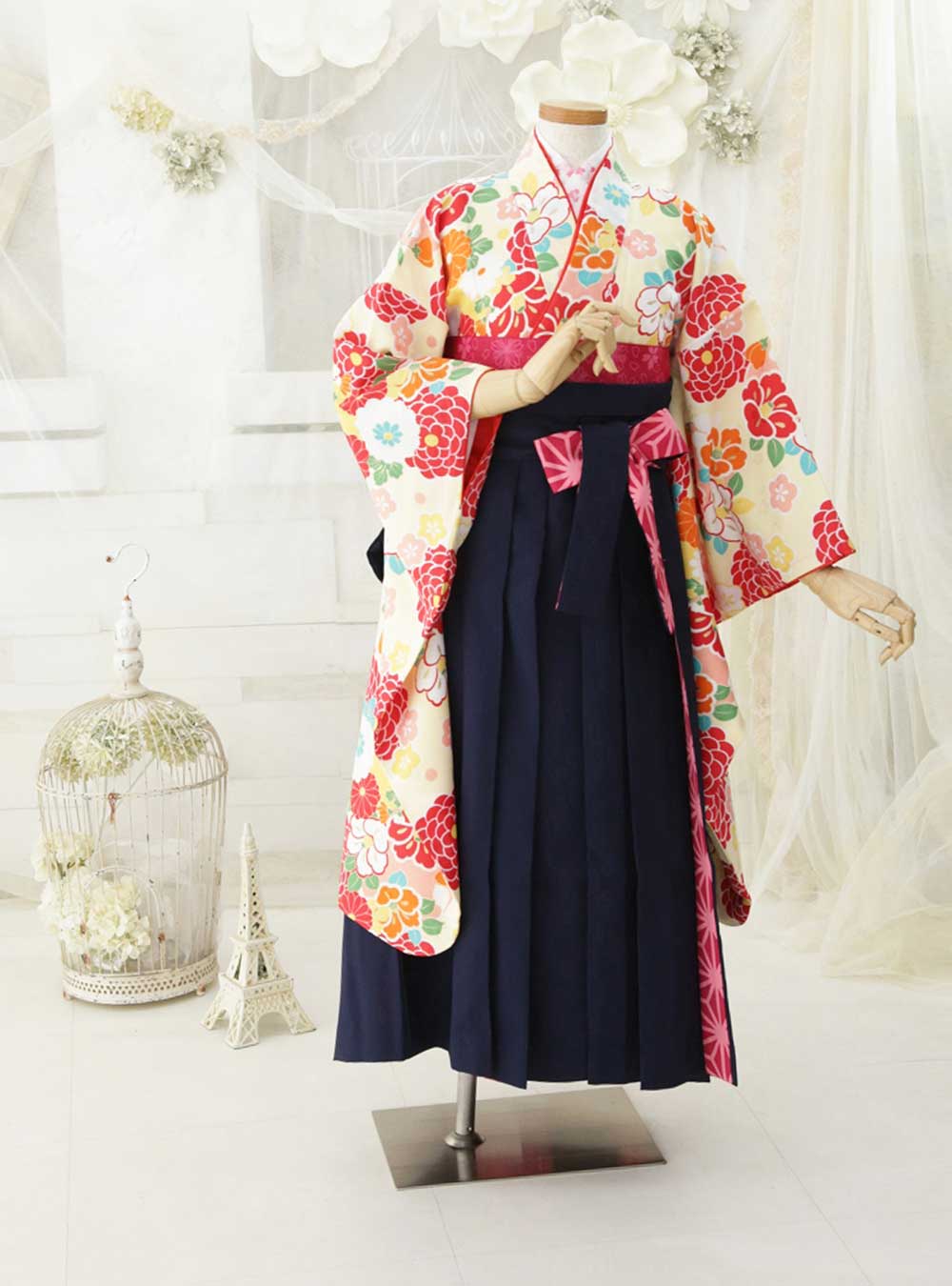 クリーム色の地に赤やピンク、黄色などの鮮やかな花柄が描かれた着物と、深い紺色の袴を組み合わせた衣装です。着物の華やかな花柄が視線を引き付け、全体に明るく元気な印象を与えます。袴の深い紺色が全体のバランスを引き締め、落ち着きと品格を感じさせます。伝統的な和の美しさを保ちながらも、華やかでモダンな雰囲気を併せ持つ1着です。