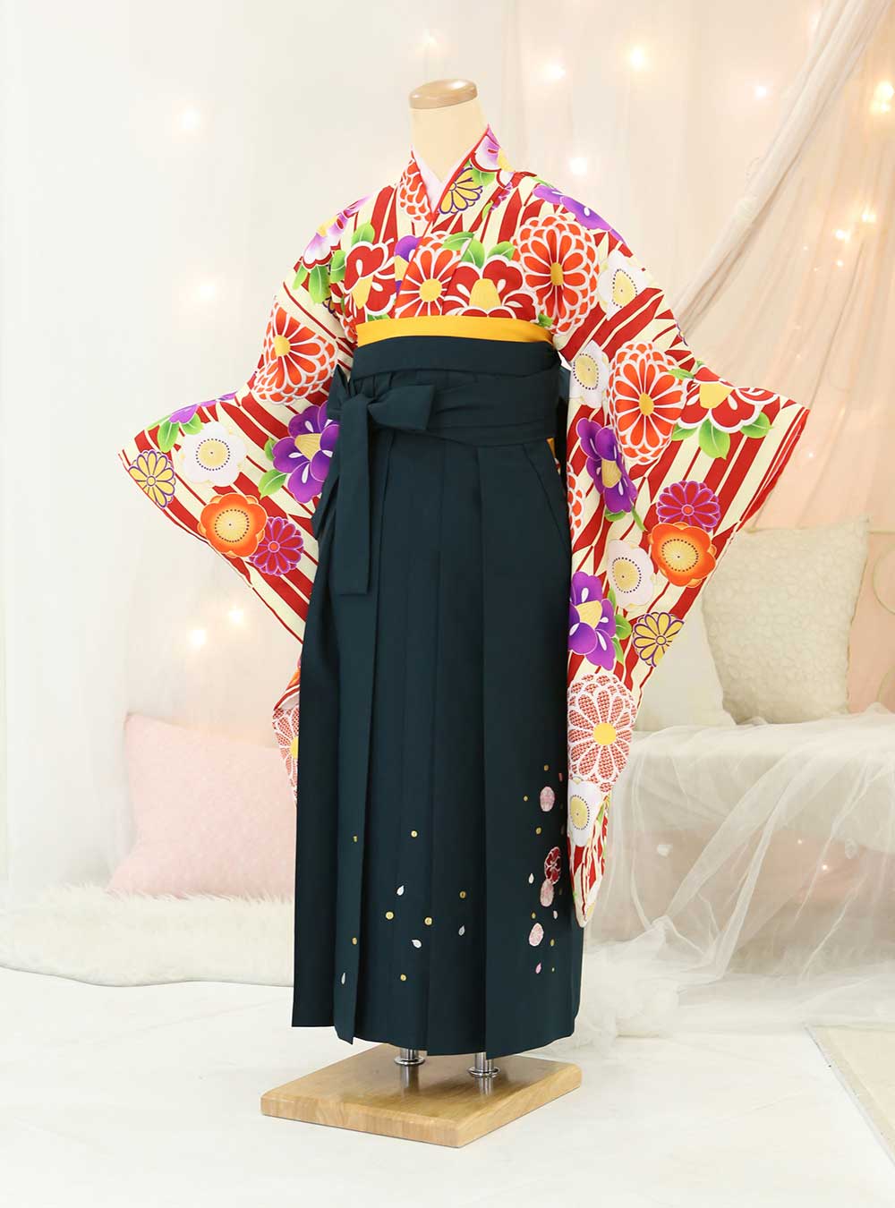 王道の赤の着物に深緑の袴を合わせた衣装です。菊や椿、梅などの花が着物全体にデザインされており色味も紫、ピンク、黄色などの色味が色鮮やかな印象です。矢絣柄が全体に施されレトロな雰囲気もあり人気のデザインです。袴の裾部分に施された小花柄の刺繡が可愛らしくポイントになっています。