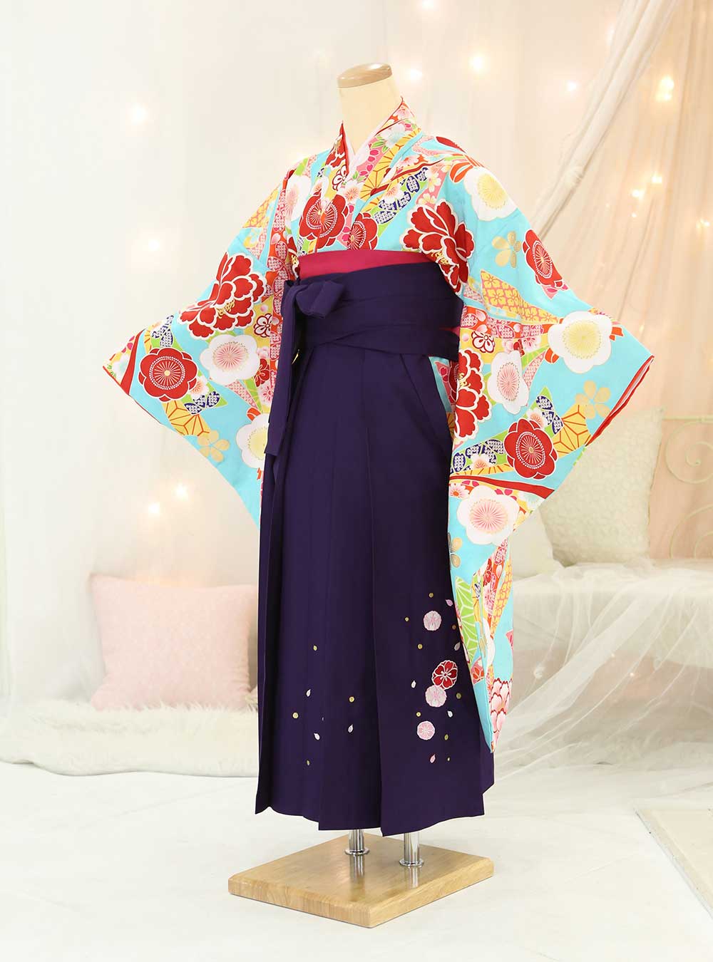 鮮やかな水色に赤や黄色などの花々があしらわれた華やかな着物です。明るい水色の着物に牡丹や梅、桜などの花がデザインされておりとても上品な印象です。色味も赤や黄色、黄緑などカラフルでとても華やかです。襟元まで柄が入っているので顔周りまで豪華で、着物が明るい分、袴の落ち着いた紫の色味が全体を引き締めます。袴の裾部分に施された小花柄の刺繡が可愛らしくポイントになっています。
