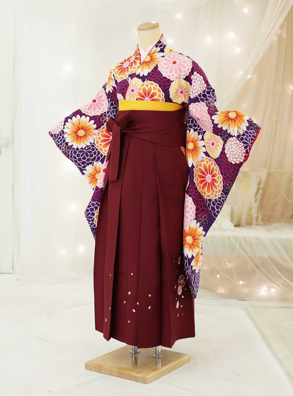 着物全体に菊の花がデザインされた華やかな印象の着物です。落ち着いた紫の色味にオレンジやピンク、白の菊の花がデザインされており上品で大人っぽい雰囲気です。黄色の帯がアクセントとなり、赤の袴は着物の落ち着いた色味で全体的に落ち着いた仕上がりです。袴の裾には小さな花が刺繡で施されておりポイントになっています。