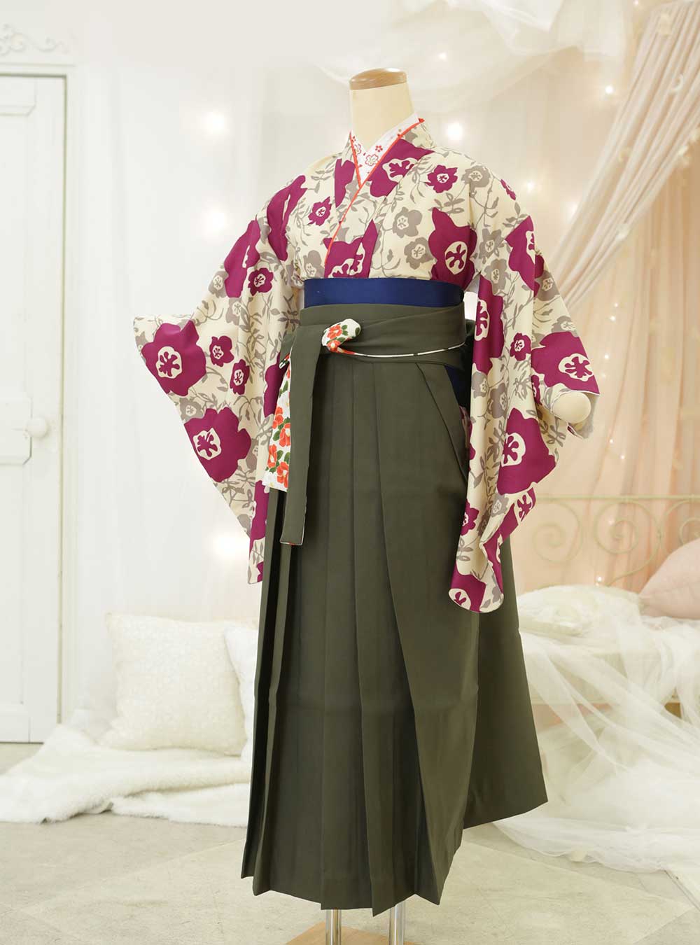 全体的に落ち着いた色味の袴です。ベージュにくすみを帯びたローズピンクの梅の花が大人っぽい雰囲気を演出します。人気のくすみカラーで統一されており落ち着いた雰囲気や大人っぽい雰囲気が好きな方におすすめの1着です。袴のリボンの裏地には可愛らしい椿の花が咲きアクセントになっています。