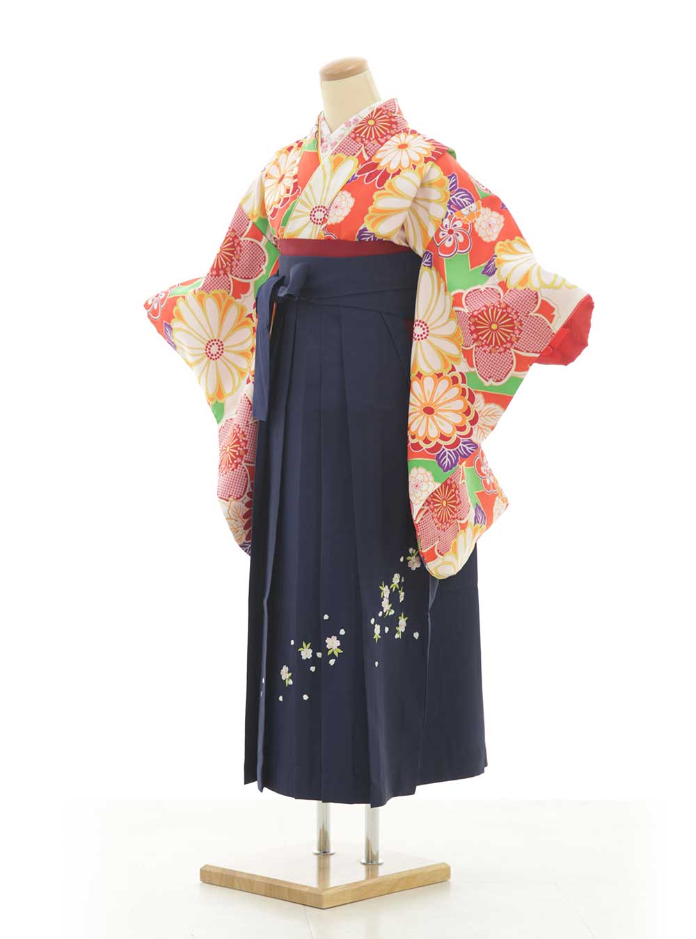 明るくカラフルな色味が可愛らしい着物です。菊や桜、牡丹などたくさんの花が着物全体にデザインされており襟元までしっかり柄が入っているのでとても華やかな印象です。明るいオレンジの地色の着物に黄色や緑、紫などの色味が多く使われているのでポップな雰囲気で、袴は落ち着いた紺色を合わせることで全体を引き締めます。柄はなくシンプルですが裾部分に小さな桜が散りばめられているので可愛らしさも感じるデザインです。