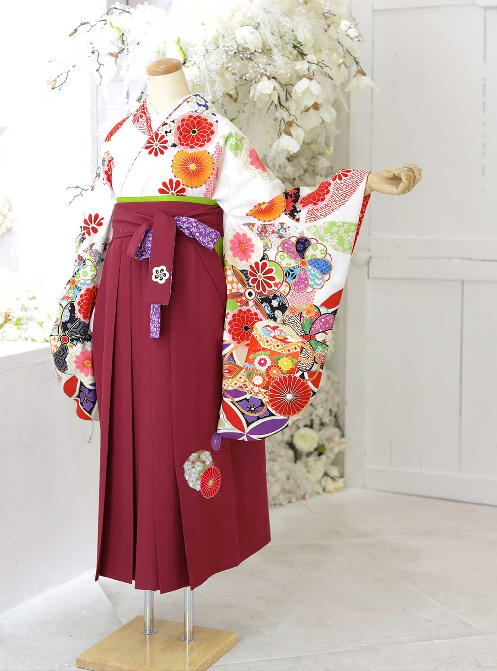 白地にカラフルな花柄や伝統的な文様があしらわれた着物と、深い赤色の袴を組み合わせた華やかな衣装です。着物は多彩な色使いと細やかなデザインが特徴で、レトロな魅力と現代的なスタイルが調和しています。袴の深い赤色が全体を引き締め、上品さと華やかさを際立たせています。明るく個性的なデザインを好む方におすすめの、エレガントで目を引く1着です。