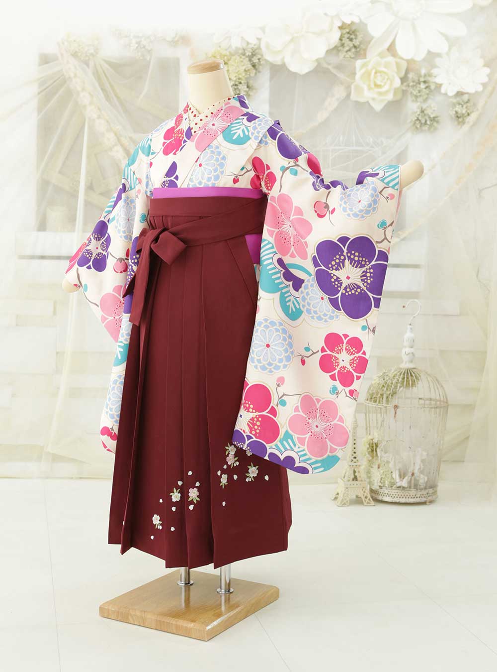 白地にピンク、パープル、ブルーの華やかな花柄が描かれた着物と、深みのある赤色の袴を組み合わせた可憐な衣装です。着物は鮮やかな色使いと大きな花柄で、明るく元気な印象を与えます。袴の深い赤色が全体を引き締め、上品さと落ち着きを演出しています。華やかさと気品を兼ね備えたデザインで、子供らしさありつつも大人っぽい魅力を持つ1着です。