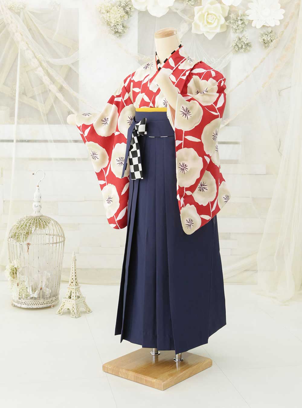 赤地に大胆な白い花柄が施された着物と、深い紺色の袴を組み合わせた個性的な衣装です。着物のデザインは大胆な色使いと大きな花柄が特徴でインパクトがあります。袴の深い紺色が全体を引き締め、シックで上品な印象を与えます。リボンの市松模様がアクセントとなり、和の伝統とモダンな要素が融合したデザインです。人目を引く華やかさと落ち着きを兼ね備えた1着です。