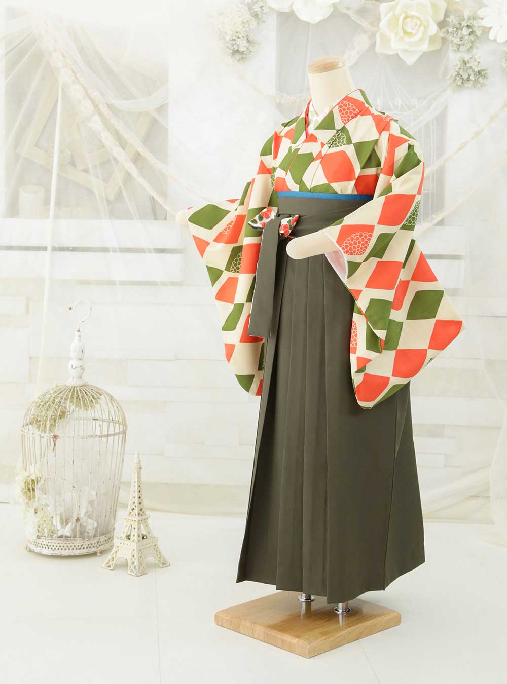 鮮やかなオレンジ、緑、ベージュの幾何学模様が施された着物と、深いカーキ色の無地の袴を組み合わせた華やかな衣装です。大胆な色使いと大きな柄の着物は視覚的なインパクトがあり、モダンな雰囲気を醸し出しています。袴は落ち着いた色合いで全体のバランスを整え、上品さと華やかさを兼ね備えたデザインとなっています。特別な場面での着用にふさわしい、和の美しさを感じさせる1着です。