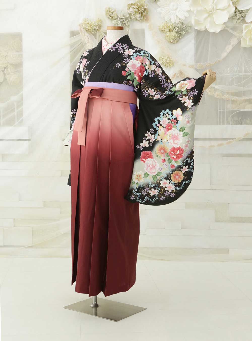 黒地に美しい花柄があしらわれた着物と、グラデーションが美しい赤茶色の袴を組み合わせたエレガントな衣装です。着物の黒い地色が全体を引き締め、華やかな花柄が上品で優雅な印象を与えます。袴のグラデーションが、動きのあるデザインに深みを加え、洗練されたスタイルを演出しています。シックでありながら華やかな装いを好む方におすすめの、魅力的で品格のある1着です。