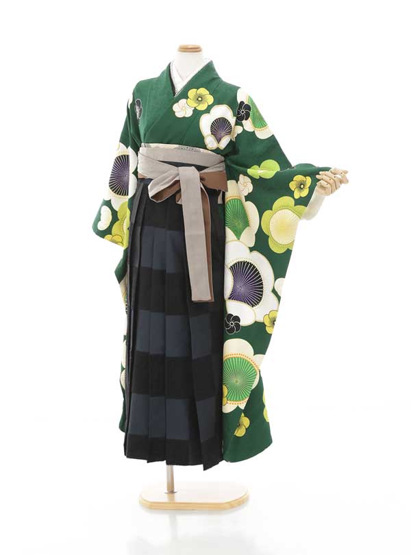 深いグリーン地に大ぶりの花柄が描かれた着物と、シックな黒とグレーのストライプ柄の袴を組み合わせたレトロモダンな衣装です。着物は鮮やかなグリーンに大胆な花柄が施され、どこか懐かしさと新しさを感じさせるデザインです。袴のストライプ柄が全体を引き締め、モダンでスタイリッシュな印象を加えています。レトロとモダンが調和したスタイルを好む方におすすめの、個性豊かな1着です。