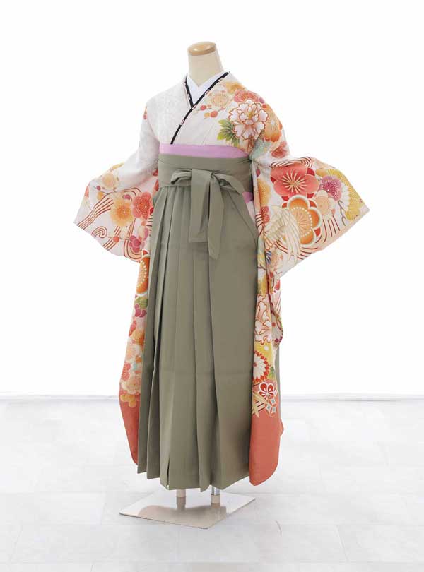 振袖と袴でコーディネートされた卒業袴。ホワイトをベースにしオレンジ、サーモンピンクの牡丹や橘、菊などの花々が鮮やかに描かれ、上品で華やかな印象になります。袴はカーキの落ち着いた色味で、振袖特融の豪華さを落ち着いた雰囲気のレトロモダンに。 昔ながらの古典柄に現代風のカラーを合わせた着物です。