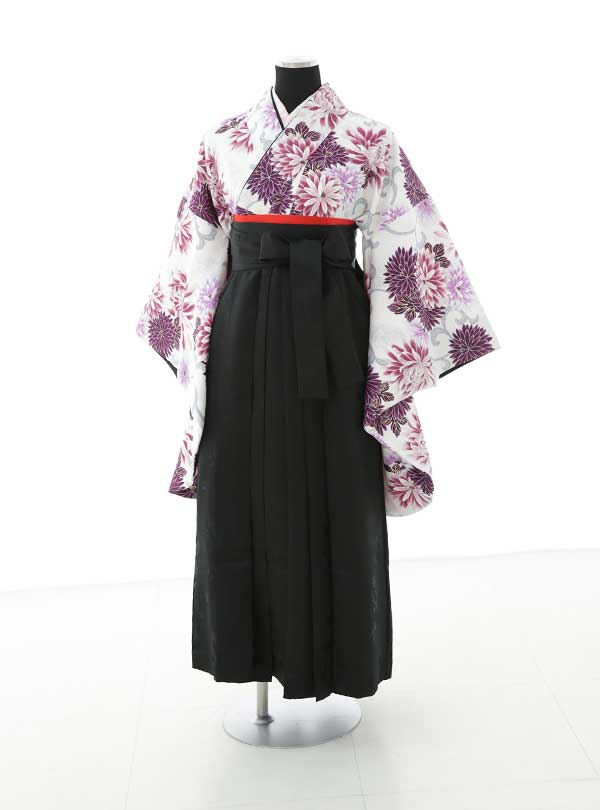 全体に菊の花がデザインされた白地の着物。着物は紫・赤紫の落ち着いた色味の大輪の花が大胆にデザインされ、さりげない金のラメがより上品な雰囲気に。袴は黒でコントラストを際立たせ、スタイリッシュでエレガントな印象を演出します。 帯は赤色でアクセントが加えられ、全体を引き締めたコーディネートに。落ち着いた色合いで大人っぽく、デザインは少し個性的な1着。