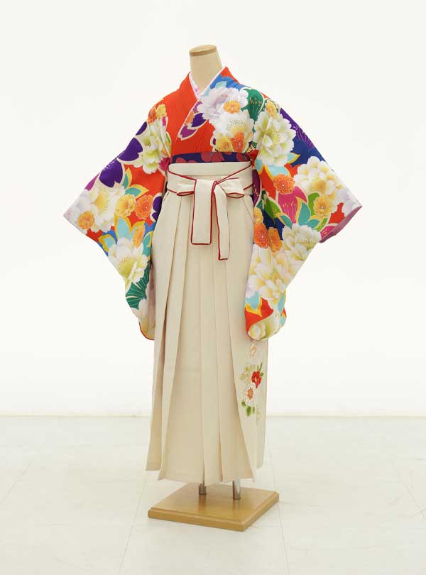 色鮮やかな花柄のデザインが特徴的な着物。着物には赤・紫・青・緑など多彩な色が使われ、大きな花柄が全体に広がるデザインで、インパクトのある1着。袴は赤い花の刺繍が施されたクリーム色の袴を使用しており、紐部分には赤のラインが施されているのもこの袴のワンポイント。 着物とのコントラストが美しく、目立つこと間違いなし!