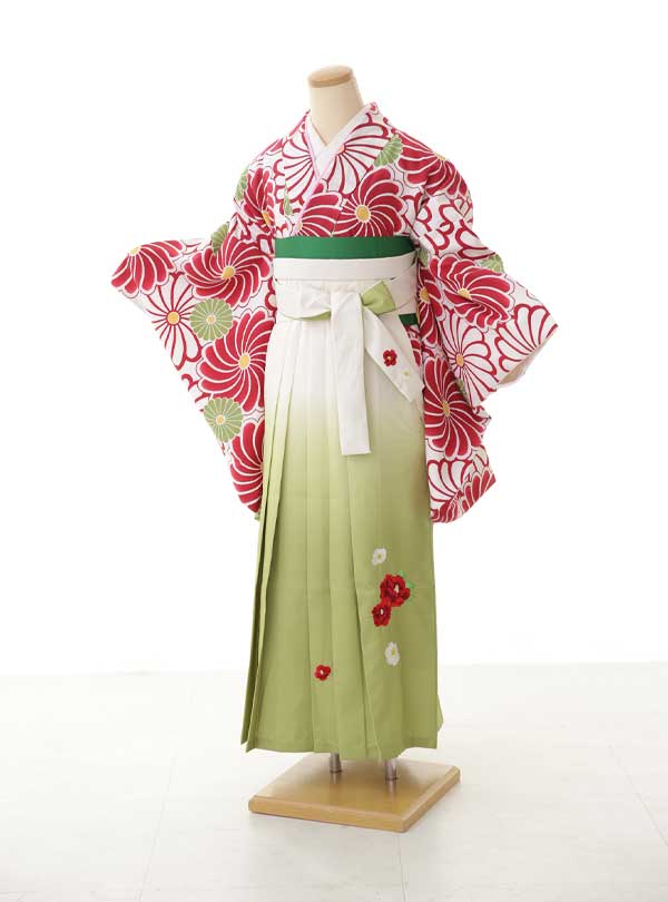 鮮やかな色使いと大胆な花柄が特徴的な着物。着物には赤と白を基調とした大きな菊の花が全面に描かれており、緑色のアクセントが入ることで華やかさが引き立つデザインに。袴は小さい白と赤の花の刺繍がさりげなく施された白から緑色への淡いグラデーションで、上着の鮮やかな柄を引き立たせながら全体のバランスを保ち、緑色の帯が着物全体のデザインを引き締めています。 大胆な花柄が珍しく、目立つこと間違いなしの1着。