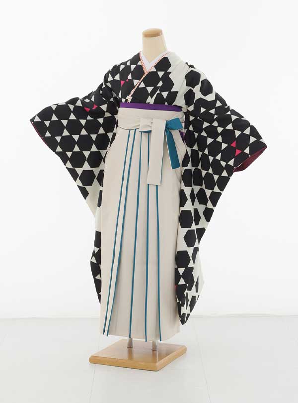 モノトーンコーデで個性的なデザインが目を引く着物。着物は黒を基調とし幾何学模様が大胆にデザインされておりスタイリッシュな印象をあたえます。袴はシンプルな白地に青いストライプがワンポイントになったデザインで、着物の大胆な柄を引き立てせたコーディネートに。 ストライプ柄なのでスタイルアップ効果も!モノトーンコーデでレトロなスタイルを楽しみたい方にオススメ。