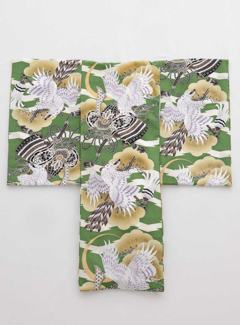 深い緑色を基調とした地に、堂々と舞う鷹が描かれており、その羽ばたきは力強さと品格を象徴しています。鷹の羽根の繊細な描写と背景の松の模様は、自然の雄大さを見事に表現しています。 また、帯や装飾に見られる幾何学模様や華やかな花柄は、歴史と現代の完成を織り交ぜ、品格のデザインに仕上がっています。お祝いの場にピッタリで伝統的な日本の美意識を体現しつつも、現代のセンスを取り入れた一着です。