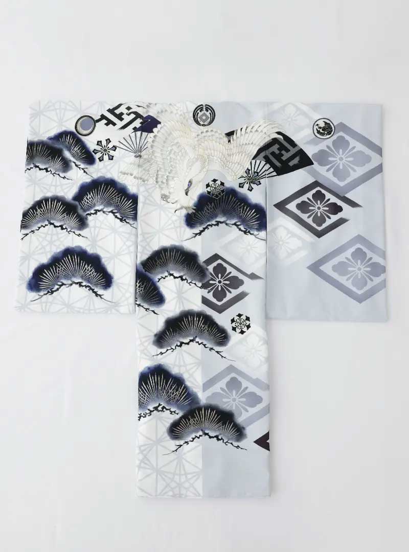 日本の伝統的な美意識を体現しているこの着物のシックな色調の中に浮かぶ松の木や鶴の模様は、長寿や幸運を象徴し、デザイン全体に優雅さと調和をもたらしています。 幾何学的な文様が全体に流れ、現代的な洗練さを感じさせつつも、古典的な日本の美のエッセンスを失わないデザインです。清らかで静謐な美しさを纏い、着る人の品格を一層引き立てる和装となっています。