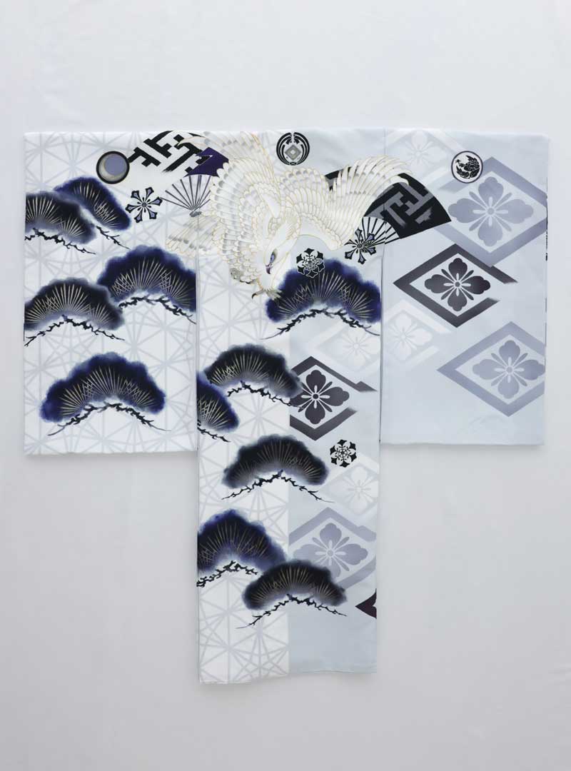 日本の伝統的な美意識を体現しているこの着物のシックな色調の中に浮かぶ松の木や鶴の模様は、長寿や幸運を象徴し、デザイン全体に優雅さと調和をもたらしています。 幾何学的な文様が全体に流れ、現代的な洗練さを感じさせつつも、古典的な日本の美のエッセンスを失わないデザインです。清らかで静謐な美しさを纏い、着る人の品格を一層引き立てる和装となっています。